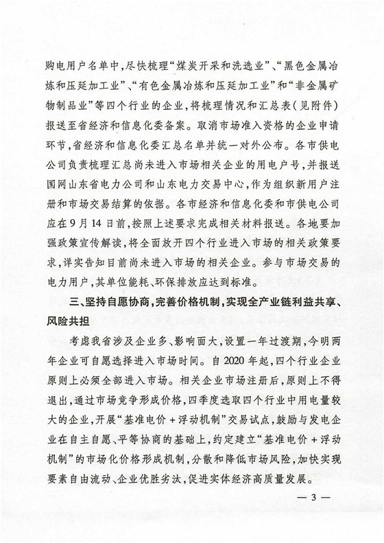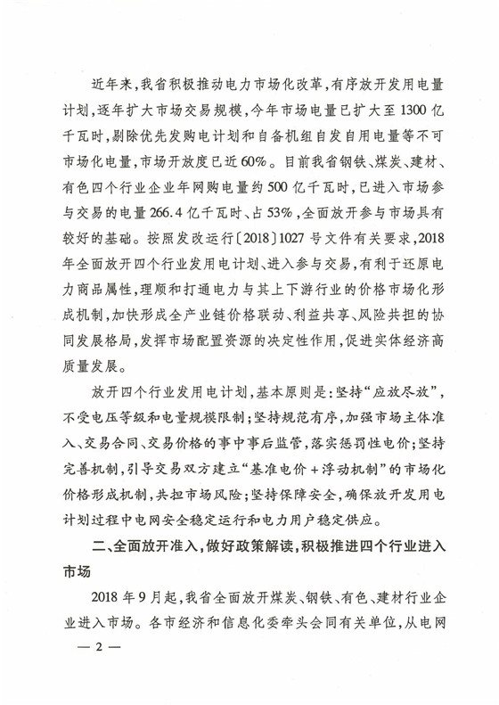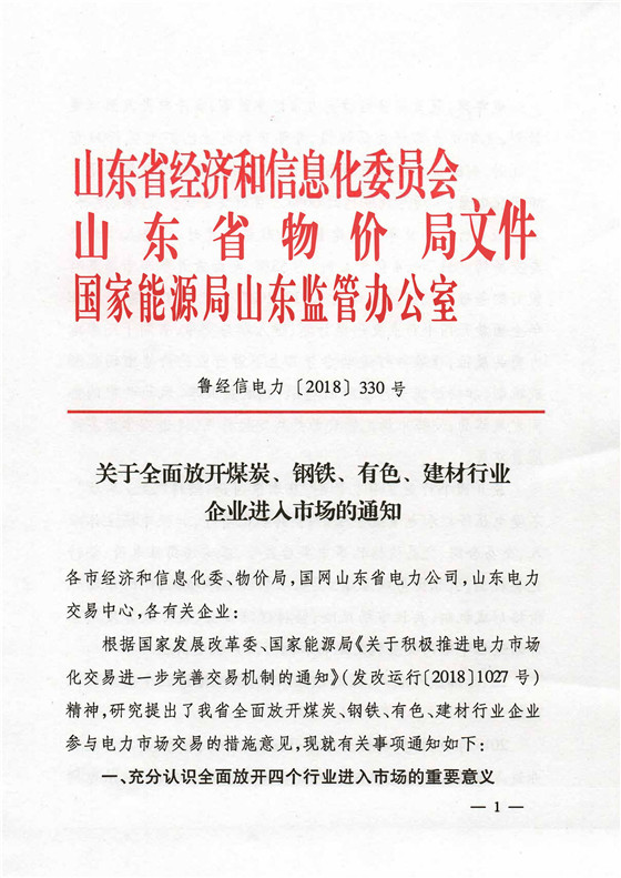 2018年 9月山東經信委、物價局、能源局聯合發文《關于全面放開煤炭、冶金、有色、建材行業企業全面進入市場的通知》(魯經信電力【2018】330 號文);強制要求煤炭、鋼鐵、有色、建材四大行業,2019年底必須納入市場化交易,否則將執行懲罰電價。